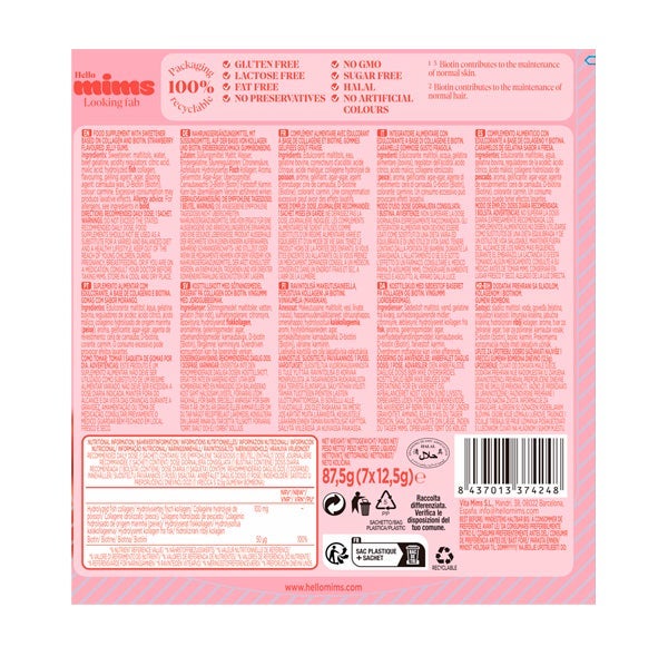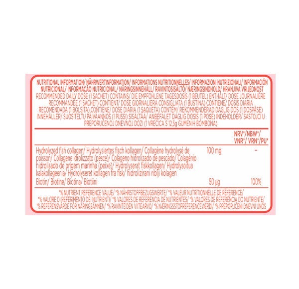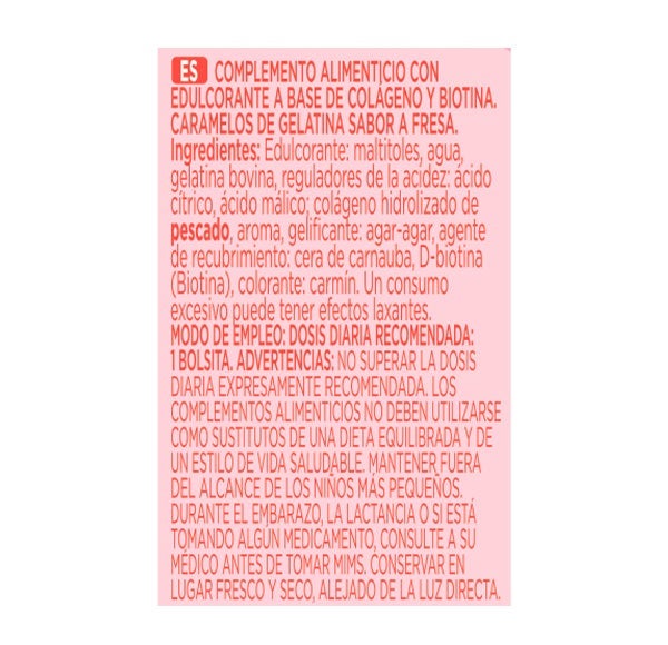 Edulcorante: maltitoles,agua,gelatina bovina, reguladores de la acídez: ácido cítrico, ácido málico: colágeno hidrolizado de pescado, aroma, gelificante: agar-agar, agente de recubrimiento: cera de carnauba, D-biotina(Biotina), colorante: carmín.