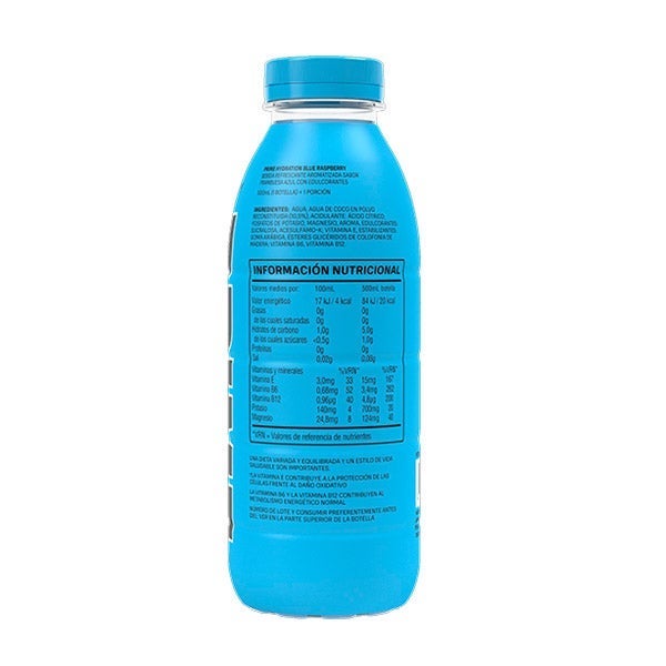 - Bebida hidratante con sabor a frambuesa azul, aromatizada y elaborada con edulcorantes.