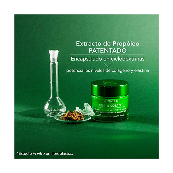 • Favorece la producción de colágeno, elastina y ácido hialurónico, aportando hidratación, elasticidad y un aspecto rejuvenecido gracias a la acción combinada del extracto de propóleo patentado, el glucógeno vegetal y la glicina natural.
