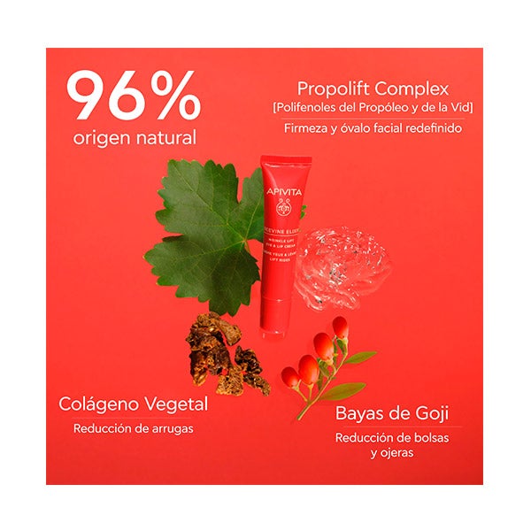 Su fórmula contribuye a suavizar las líneas de expresión, reforzar la firmeza cutánea y alisar los párpados, gracias a la sinergia de los polifenoles del propóleo y la vid junto con el colágeno vegetal.