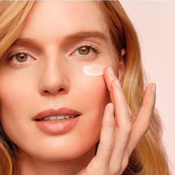 Con la yema del dedo anular, toma aproximadamente 0,1 g (la cantidad equivalente a un grano de arroz) para ambos ojos y extiende suavemente bajo los ojos, en los extremos exteriores, sobre los párpados y en el entrecejo.