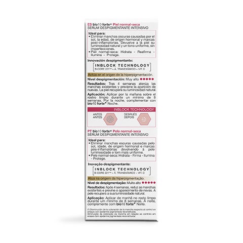 Disminuye de forma visible las manchas oscuras de diferentes orígenes: solares, de la edad, hormonales o post-inflamatorias. Incorpora la avanzada INBLOCK TECHNOLOGY, que combina B-CORE 221TM y Ácido Tranexámico para abordar la hiperpigmentación de manera completa, actuando en todas las etapas del desarrollo de las manchas. Tras 4 semanas de uso, el tono cutáneo luce más uniforme, radiante y con las manchas visiblemente difuminadas.
