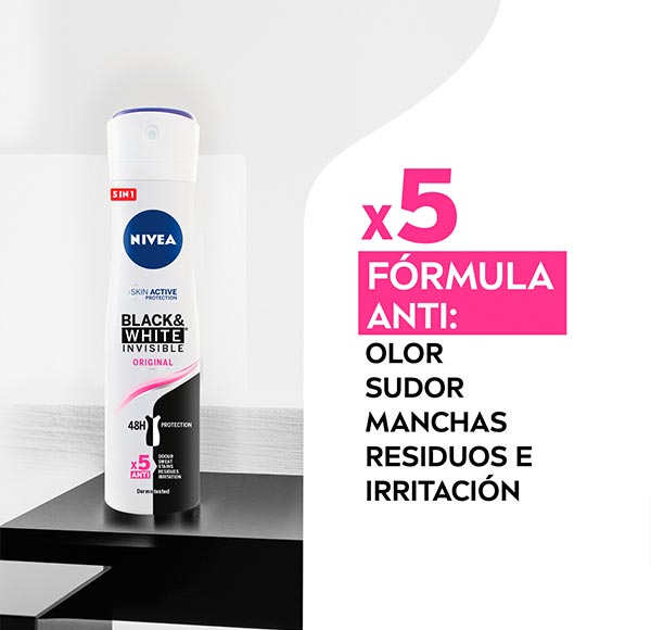NIVEA Black & White Invisible Original Spray brinda una protección antitranspirante de hasta 48 horas, al mismo tiempo que cuida y respeta la piel.
