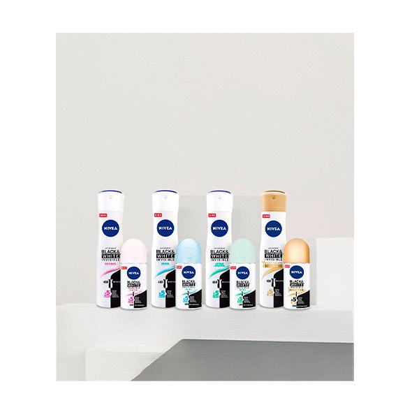 NIVEA Black & White Invisible Fresh Spray: Este desodorante ha sido diseñado junto a especialistas en textiles del “Hohenstein International Textile Institute” para ofrecer una protección efectiva contra la transpiración, evitando las manchas blancas en la ropa oscura y minimizando las marcas amarillentas en las prendas claras. Brinda una protección antitranspirante de hasta 48 horas acompañada de una fragancia fresca. Su aplicación en spray proporciona una sensación de frescor al contacto con la piel y deja un aroma que perdura: Black & White Invisible Fresh Spray.