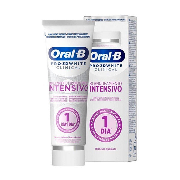 La pasta dentífrica Oral-B Pro 3D White Clinical Blanqueamiento Intensivo ha sido clínicamente comprobada para lograr una sonrisa más blanca en solo un día, eliminando las manchas superficiales. Es la pasta blanqueadora más eficaz de Oral-B gracias a su tecnología iónica exclusiva: disuelve las manchas sin necesidad de frotar, las elimina mediante un proceso de blanqueamiento iónico, ayuda a prevenir la aparición de nuevas manchas y resulta adecuada incluso para dientes sensibles.