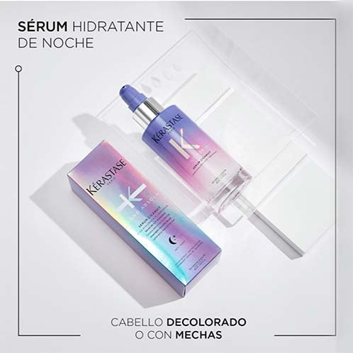 Tratamiento nocturno reparador con elevada concentración de ácido hialurónico, diseñado para reestructurar la fibra capilar en melenas decoloradas.