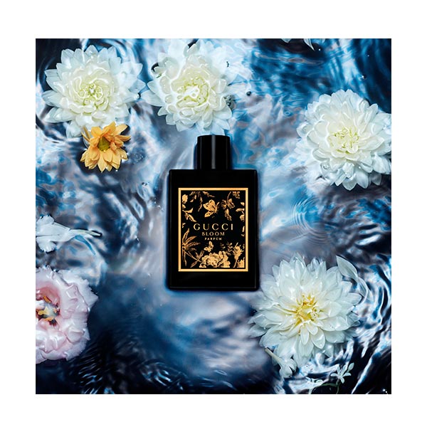 El frasco, concebido en un elegante negro medianoche, refleja la intensidad y la fuerza del perfume que contiene. El motivo icónico de la firma —con hojas, flores, ramas de cerezo y mariposas— se reinterpreta con un acabado dorado que transmite sofisticación y calidez. Gucci Bloom se presenta como una representación actual de la feminidad floreciente, un escenario de autodescubrimiento donde la belleza se expande y las mujeres celebran su propia transformación.