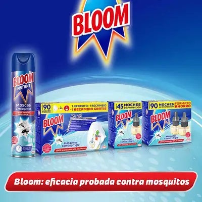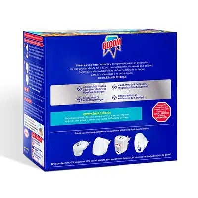 Bloom Eléctrico Líquido es la solución perfecta contra el mosquito común y tigre. Recambios compatibles con cualquiera de los aparatos electricos líquidos de Bloom. Hasta 90 noches de protección.