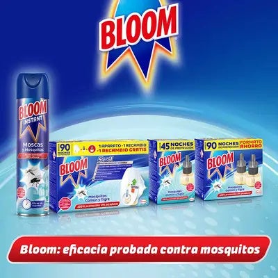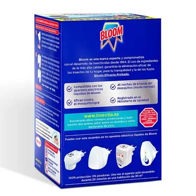 Bloom Eléctrico Líquido es la solución perfecta contra el mosquito común y tigre. Recambios compatibles con cualquiera de los aparatos electricos líquidos de Bloom. Hasta 45 noches de protección.