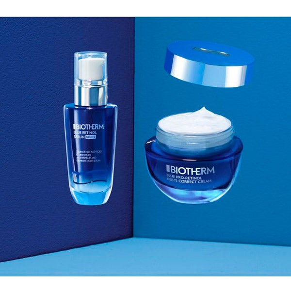 Blue Retinol Night Serum Facial trabaja cada noche sobre las arrugas, ayudando a mantenerlas suaves y uniformes para revelar una apariencia más joven y revitalizada.