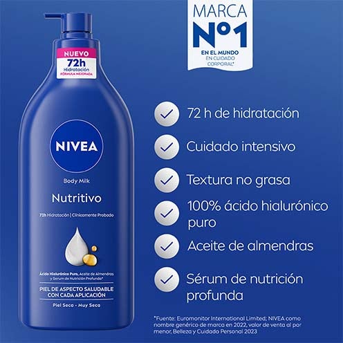 NIVEA Body Milk Nutritivo es una leche corporal enriquecida con el Sérum de Hidratación Profunda y contiene el doble de aceite de almendras que la fórmula anterior, proporcionando nutrición incluso a la piel seca o extremadamente seca.