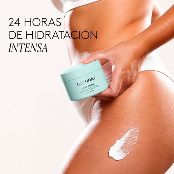 EXOTIC ORANGE es una crema corporal con una textura tipo mousse que se desliza suavemente sobre la piel, brindando hasta 24 horas de hidratación continua.