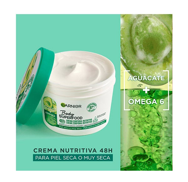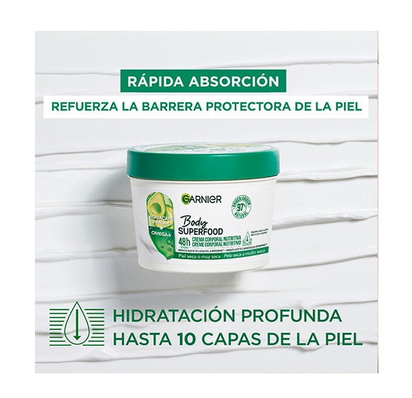 Garnier Body Superfood Crema Corporal Nutritiva con Aguacate y Omega 6 está pensada para pieles secas. Proporciona hidratación en profundidad, alcanzando hasta 10 capas de la epidermis, mientras nutre y fortalece la barrera natural de la piel. Su textura ligera se absorbe con rapidez y ofrece hidratación durante 48 horas.