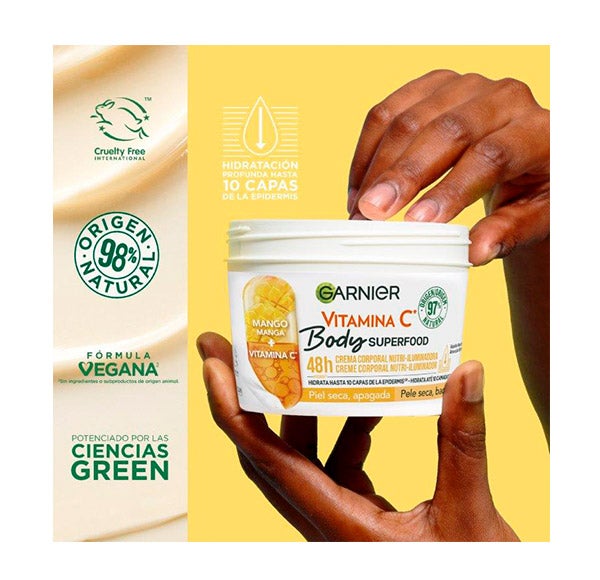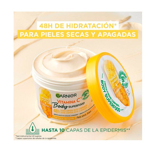 La crema corporal Garnier Body Superfood Mango + Vitamina C ofrece hasta 48h de intensa hidratación y aporta brillo a la piel seca o con falta de vitalidad.