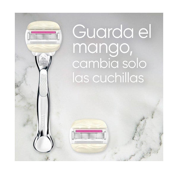 Esta maquinilla Venus ha sido creada pensando en las necesidades del cuerpo femenino. Dispone de 5 hojas que garantizan un resultado apurado y una piel increíblemente suave. Sus recambios incorporan bandas hidratantes de Olay que liberan aceites y una delicada fragancia de sugarberry. Gracias a su cabezal pivotante, se adapta con facilidad a cada zona del cuerpo. Todos los recambios Venus pueden utilizarse con cualquier mango Venus, a excepción de Simply Venus y Venus para vello púbico.