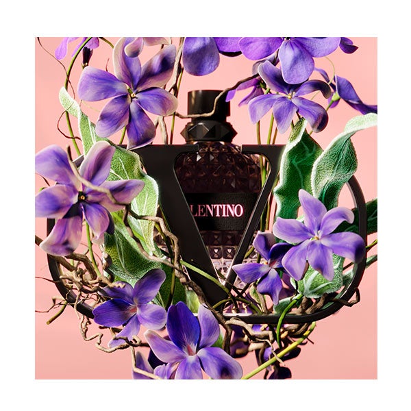 El frasco luce los distintivos studs inspirados en la arquitectura romana, símbolo inconfundible de Valentino. Estas tachuelas rodean también el cuello del envase, aportando un aire de accesorio de moda.