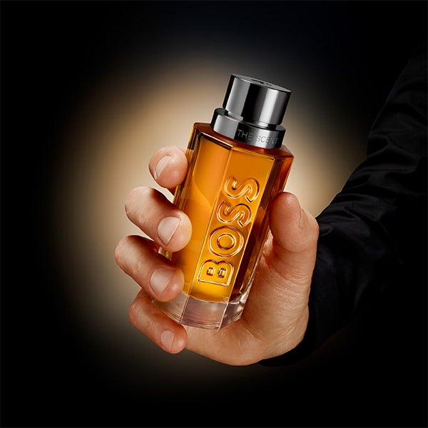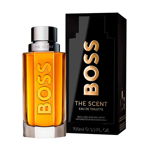 BOSS The Scent interpreta la sensualidad moderna en un elegante frasco recargable con el logotipo BOSS grabado en vidrio translúcido y un tapón en tono cobre decorado con el monograma de Doble B. Su estructura facetada y distintiva refleja el juego sensorial y las tonalidades ardientes de este perfume, evocando las múltiples dimensiones de una pareja poderosa.