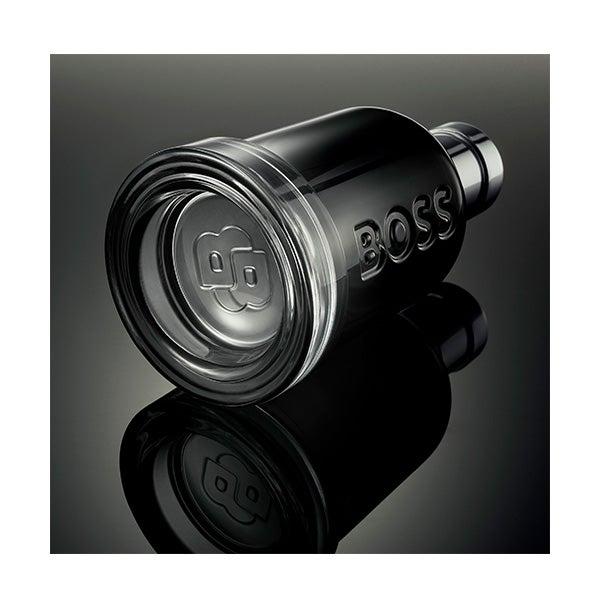 El frasco de BOSS Bottled Beyond reinterpreta un diseño clásico con un cuerpo de cristal lacado en negro, un ribete de textura doble en piel y un tapón gris metalizado. Un degradado que va del negro al gris ahumado refuerza su carácter masculino, mientras el monograma grabado de la Doble B simboliza la dualidad de la fragancia.