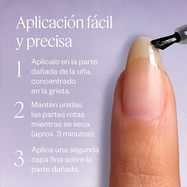 Gracias a su innovador sistema que pasa de líquido a sólido, actúa directamente sobre la fractura: se aplica como una fórmula ligera que se adhiere a la fisura y, al secarse, se transforma en un parche invisible y resistente que sella los bordes para un acabado homogéneo y duradero incluso debajo del esmalte. Su superficie uniforme disimula imperfecciones y permite usar cualquier color sin que la rotura se perciba.