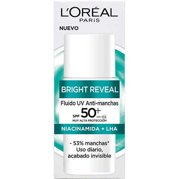 Bright Reveal Fluido Hidratante Anti-manchas con Filtro UV SPF50+ y Niacinamida de L'Oréal Paris, ideal para devolver la armonía y uniformidad al cutis.