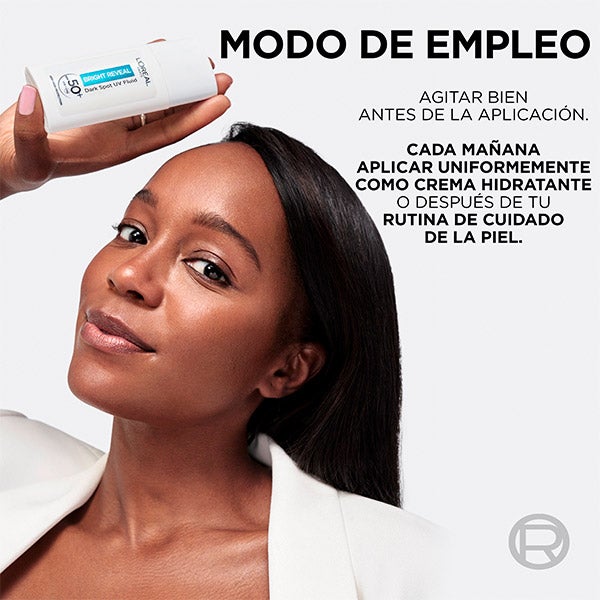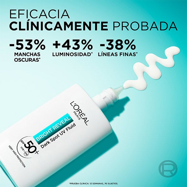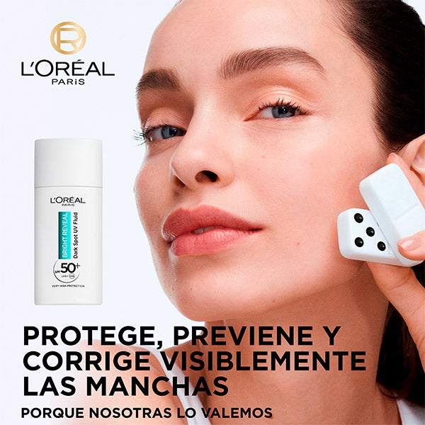 Ilumina tu piel con el Bright Reveal Fluido Hidratante Anti-manchas con Filtro UV SPF50+ y Niacinamida de L'Oréal Paris. Este fluido diario de tecnología avanzada ofrece alta protección solar, resguarda tu piel, previene la aparición de manchas y contribuye a reducir su visibilidad.