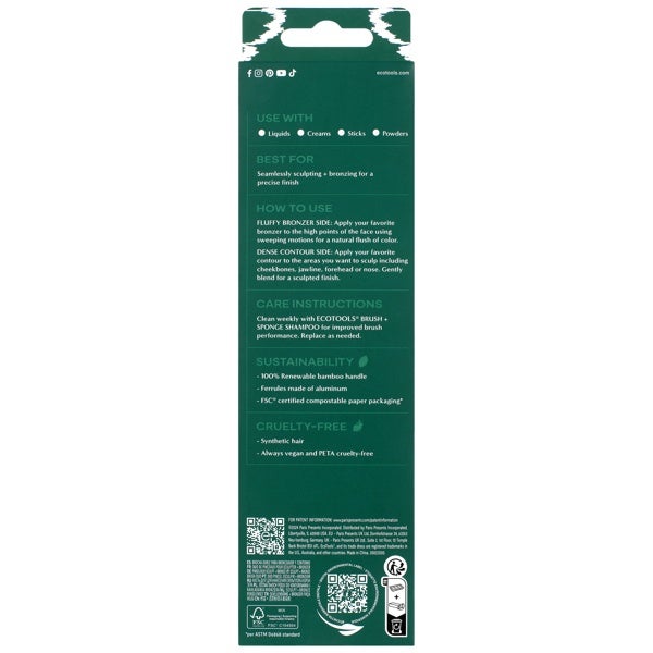 Ambos extremos son perfectos para difuminar productos de contorno y bronceado ya sea en formato líquido, crema, barra o polvo. Como todos los artículos EcoTools, esta brocha de maquillaje es completamente vegana y no testada en animales.