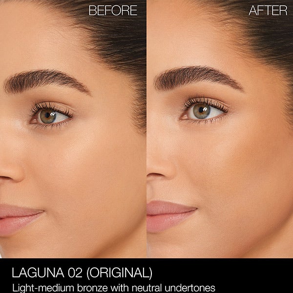 - En bases de tono claro, se recomienda Laguna Bronzing Powder con subtono neutro o cálido. Para pieles más oscuras, elegir matices rojos o neutros que realcen la profundidad y el contraste del color.