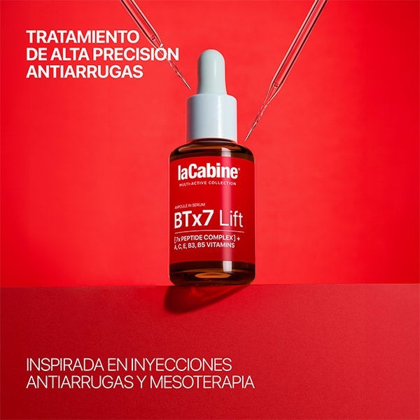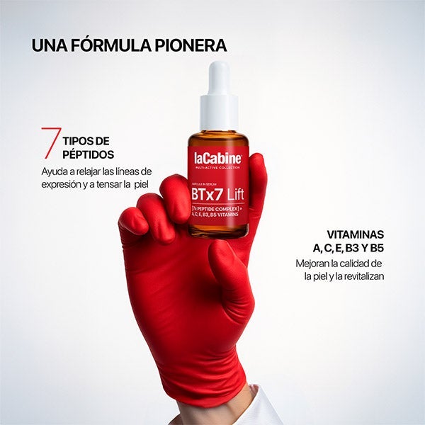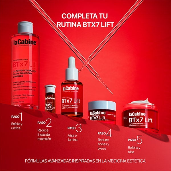El Sérum Facial BTX7 Lift une 7 péptidos con acción tensora y un complejo vitamínico con A, C, E, B3 y B5, inspirado en técnicas profesionales de mesoterapia y tratamientos antiarrugas inyectables. Su uso diario suaviza visiblemente las líneas de expresión, mejora la firmeza y refuerza la luminosidad del rostro, proporcionando una alternativa tópica eficaz frente a los procedimientos médico-estéticos.