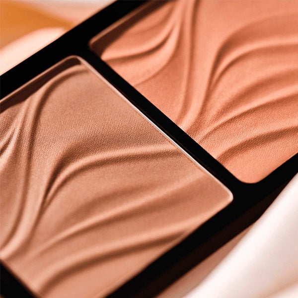 Distribuye el bronceador cálido sobre las sienes, los pómulos y la mandíbula para aportar un toque de luminosidad dorada. Emplea el tono frío de contorno en las hendiduras de las mejillas, los laterales de la nariz y el contorno del rostro para esculpir. Difumina ambos tonos con suavidad hasta conseguir un acabado natural y bien definido.