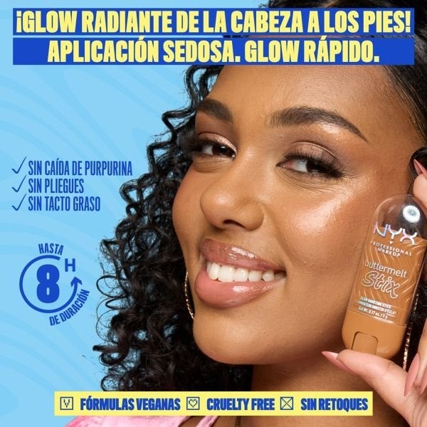 Logra una luminosidad radiante con los Buttermelt Glow Barra Iluminadora Potenciadora de NYX Professional Makeup, un iluminador cremoso con textura de manteca que se adapta perfectamente a la piel.