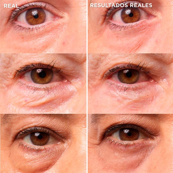 - Desinflama: Forma una película ligera y adherente que comprime las bolsas de los ojos sin generar tirantez ni grietas.