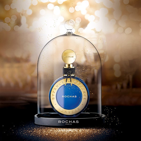 Eau de Parfum Byzance de Rochas se inspira en el magnetismo y la elegancia de las noches parisinas. Es una fragancia intensa y sofisticada que irradia luz y encanto, presentada en un frasco de tonos azul profundo con detalles dorados.