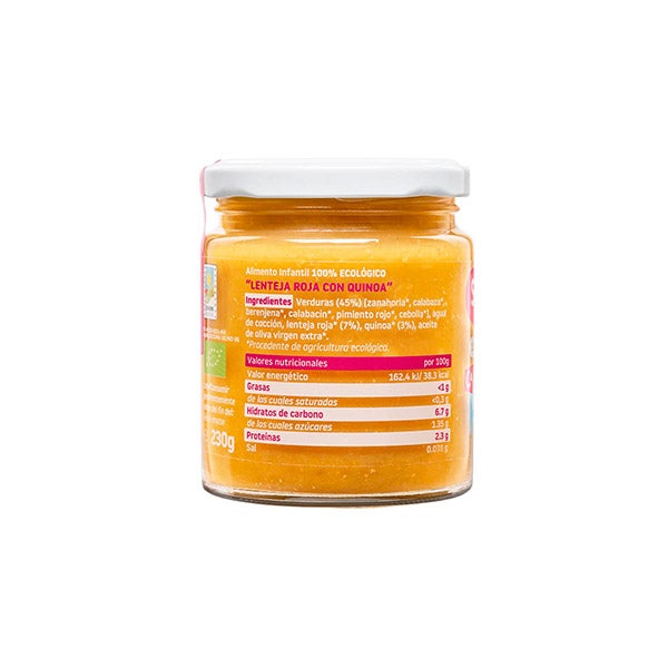 Verdura (45%) [zanahoria, calabaza, berenjena, calabacín, pimiento rojo, cebolla], agua de cocción, lenteja roja (7%), quinoa (3%), aceite de oliva virgen extra.