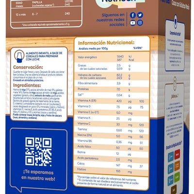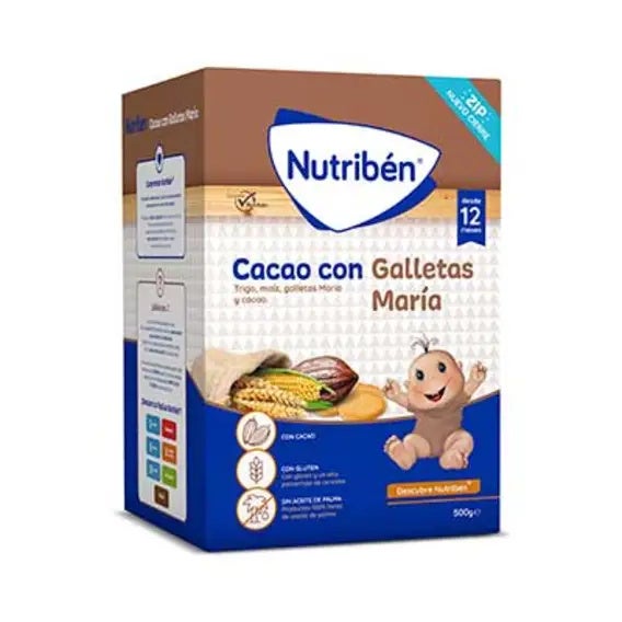 La papilla Nutribén Cacao con galletas María está elaborada para alimentar a tu bebé a partir de los 12 meses, dentro de una dieta variada. Es una papilla instantánea ideal para incorporar el cacao en la dieta del bebé en meriendas y desayunos. Incorpora galletas María que le aportan un nuevo y delicioso sabor. Enriquecida con calcio y vitaminas. Rápida disolución en leche. En plato y en biberón.