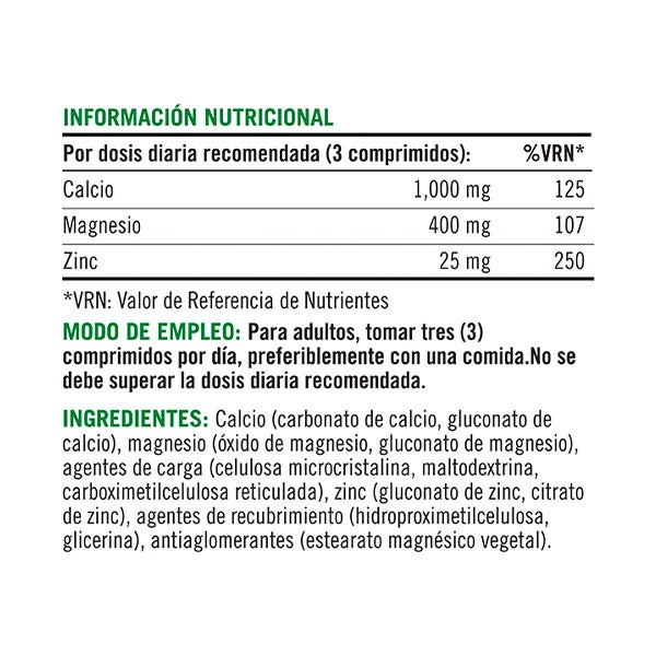 Calcio (carbonato de calcio, gluconato de calcio), magnesio (óxido de magnesio, gluconato de magnesio), agentes de carga (celulosa microcristalina, maltodextrina, carboximetilcelulosa reticulada), zinc (gluconato de zinc, citrato de zinc), agentes de recubrimiento (hidroproximetilcelulosa, glicerina), antiaglomerantes (estearato magnésico vegetal).