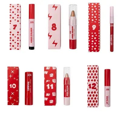El Calendario de Adviento de 12 Días de JöVö incluye una selección exclusiva de 12 productos de maquillaje diseñados para rostro, ojos y labios. Cada uno te invita a experimentar con diferentes estilos y acabados: