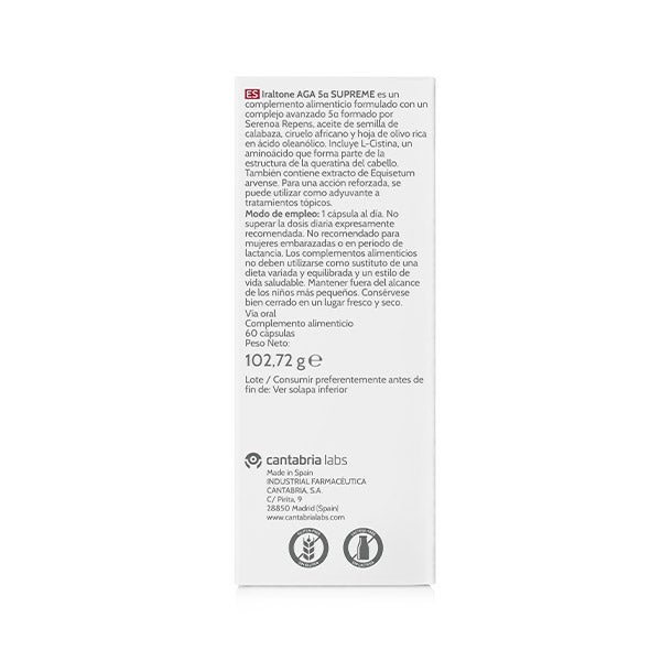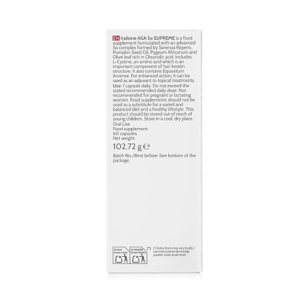 Suplemento nutricional desarrollado con un avanzado complejo 5α que combina Serenoa repens, aceite de semillas de calabaza, extracto de ciruelo africano y hojas de olivo con alto contenido en ácido oleanólico, logrando una óptima concentración de agentes que actúan sobre la 5α reductasa. Contiene además L-Cistina, aminoácido esencial que interviene en la estructura de la queratina capilar.