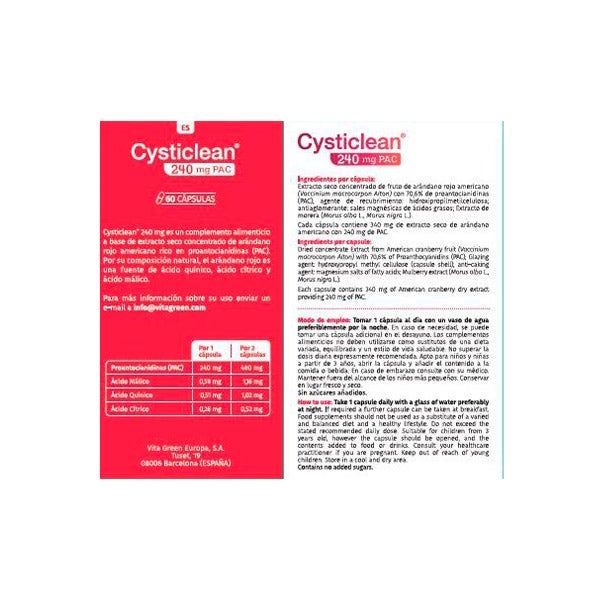Cada cápsula contiene: 340 mg de extracto seco de arándono americano con 240 mg de PAC.