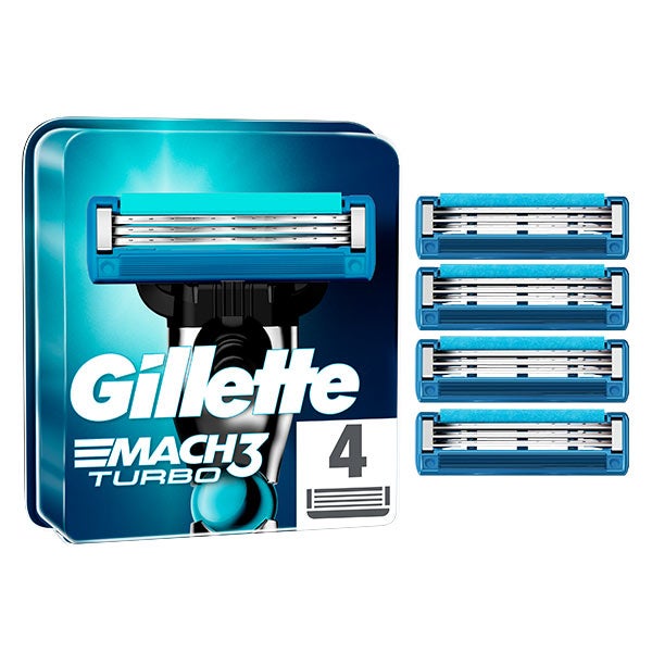 Ten preparado todo lo esencial para un afeitado impecable con el recambio Gillette Mach3 Turbo 4 ud. Este paquete incluye cuatro cartuchos con cuchillas de triple hoja que proporcionan un afeitado más preciso y cómodo. Sus hojas con tecnología anti-fricción minimizan la irritación cutánea, dejando la piel increíblemente lisa. ¡Cuida cada detalle y disfruta de un afeitado perfecto!