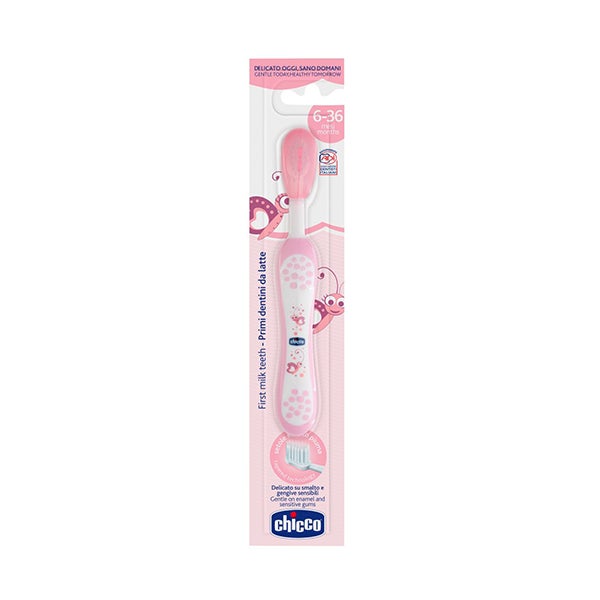 El cepillo infantil de Chicco ha sido creado para hacer más sencilla la limpieza bucal del bebé. Es suave con las encías y cuenta con filamentos ultrafinos de textura ligera tipo pluma. Indicado para edades de 6 a 36 meses. Disponible en color rosa.
