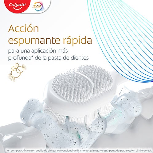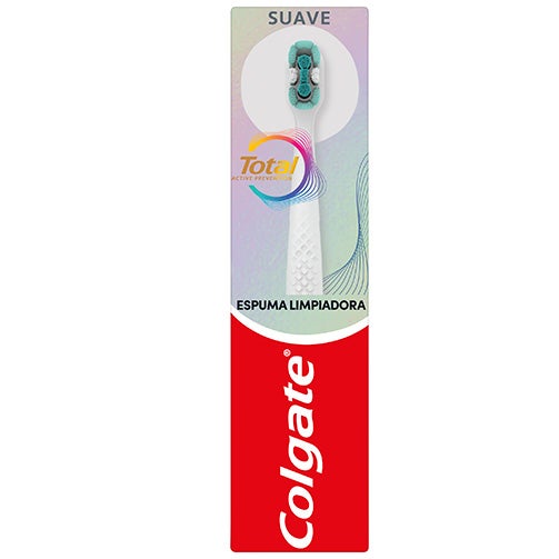 Limpia tu boca con el cepillo Colgate Espuma Limpiadora. Este cepillo manual está especialmente creado para ofrecer una prevención activa, ayudando a combatir la causa principal¹ de la caries, la placa, los problemas en las encías, el mal olor bucal, la acumulación de sarro y las manchas superficiales. Su acción espumante actúa de manera rápida, permitiendo que la pasta dental se distribuya más profundamente² en toda la cavidad bucal. Gracias a sus filamentos de puntas finas, este cepillo logra alcanzar con mayor precisión² la línea de las encías y los espacios entre dientes. Además, incorpora el doble de filamentos³ para una mayor densidad. Mantén tu sonrisa saludable con la protección y cuidado de Colgate.