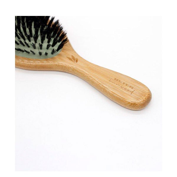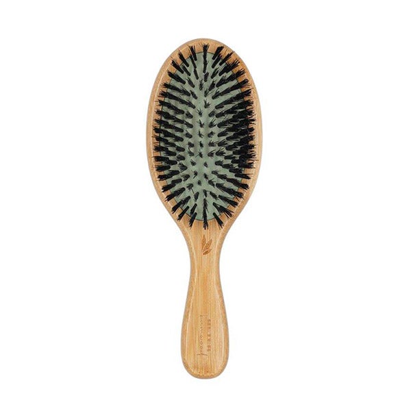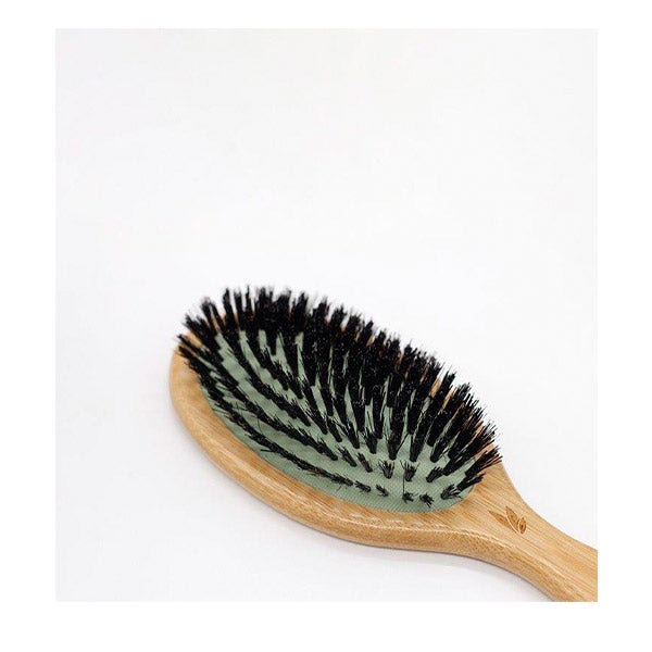 Cepillo con base de madera y cerdas combinadas de jabalí y nylon, diseñado para desenredar el cabello con delicadeza y suavidad, aportándole movimiento, flexibilidad y una apariencia más sana.