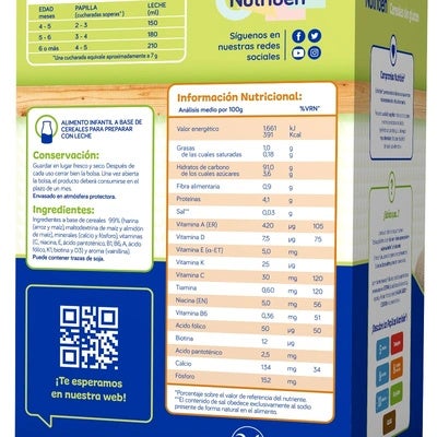 Nutribén Papilla de cereales sin gluten para bebés a partir de 4 meses es una opción nutritiva y equilibrada para comenzar la dieta complementaria de tu bebé. Diseñada pensando en sus necesidades, esta papilla suave combina los beneficios del maíz y el arroz, ofreciendo un aporte esencial de vitaminas y minerales sin azúcares añadidos. Ideal para bebés desde los 4 meses, es fácil de preparar y adecuada para cualquier momento del día: desayuno, merienda o cena.