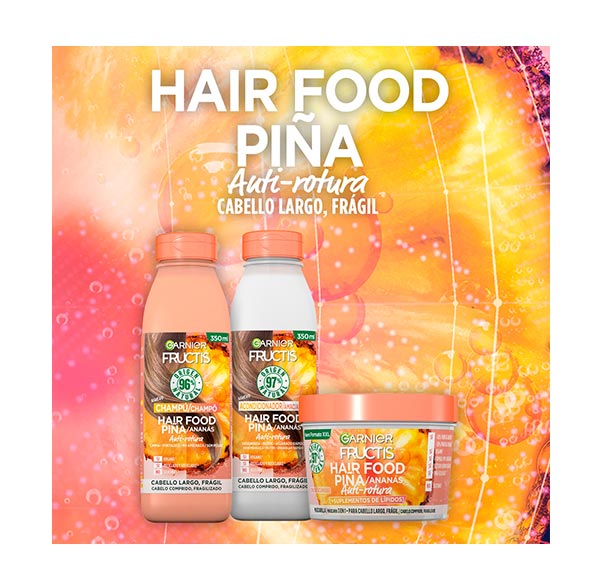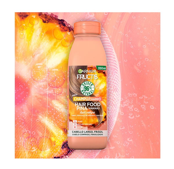Experimenta el champú de Piña Garnier Fructis Hair Food, una fórmula vegana compuesta en un 96% de ingredientes de origen natural y sin siliconas, que limpia y nutre el cabello largo y delicado sin dejarlo pesado.
