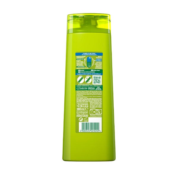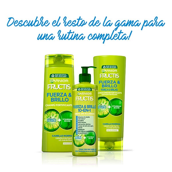 El champú Fructis Fuerza y Brillo es un tratamiento fortalecedor que combina esencia de pomelo y vitaminas B3 y B6 para purificar, revitalizar y reforzar la estructura capilar desde la raíz.