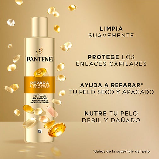 Experimenta el poder del champú Pantene Miracle Repara y Protege. Este champú de textura cremosa limpia suavemente a la vez que aporta nutrición e incrementa la protección de los enlaces del cabello. En el centro de su fórmula destaca la exclusiva tecnología PRO-V, potenciada con ACTIVE NUTRI-PLEX, una combinación de nutrientes que ayuda a reparar* el cabello seco, sin brillo o estropeado.