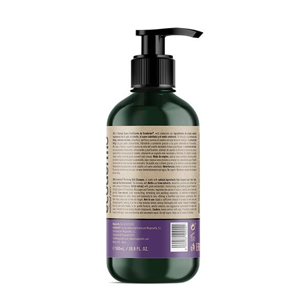 El Champú Suave Purificante de Ecoderma está formulado con componentes naturales que cuidan el cuero cabelludo, el cabello, la piel y también el entorno.