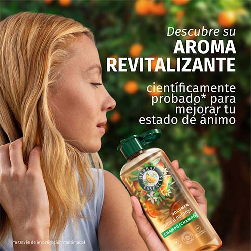 Déjate envolver por un estallido de cítricos auténticos. Herbal Essences Champú Volumen con Aroma a Naranja despierta y da vida al cabello fino desde la raíz hasta las puntas. Disfruta de una sensación de frescor con su fragancia cítrica llena de vitalidad. Enriquecido con nutrientes botánicos y esencias naturales de naranja y limón procedentes de Italia, presenta una fórmula vegana ligera y sin siliconas. Su composición natural ofrece una limpieza intensa y contribuye a realzar el volumen en cada uso.