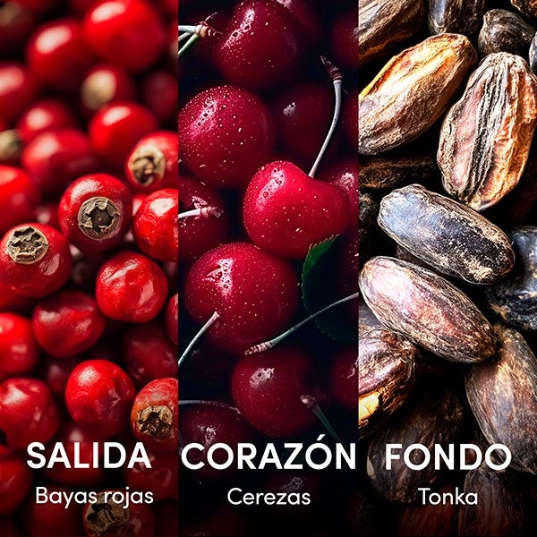Esta exquisita bruma combina con equilibrio la riqueza natural de las bayas rojas con el toque ácido de la cereza y las notas cálidas de tonka de fondo amaderado.