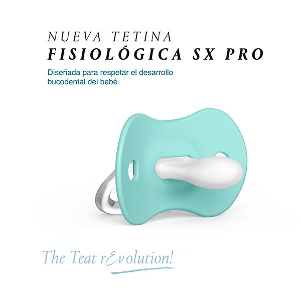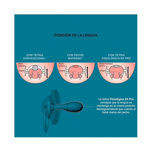 La tetina Fisiológica SX Pro está diseñada para no ocupar espacio innecesario en la boca, ofreciendo al bebé una sensación muy similar a la de su estado natural o fisiológico sin chupete.